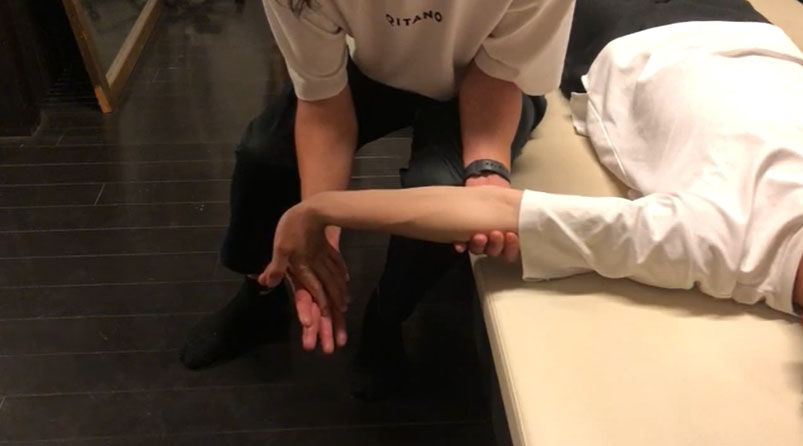 03-01.前腕 尺側手根屈筋ストレッチ(仰臥位)